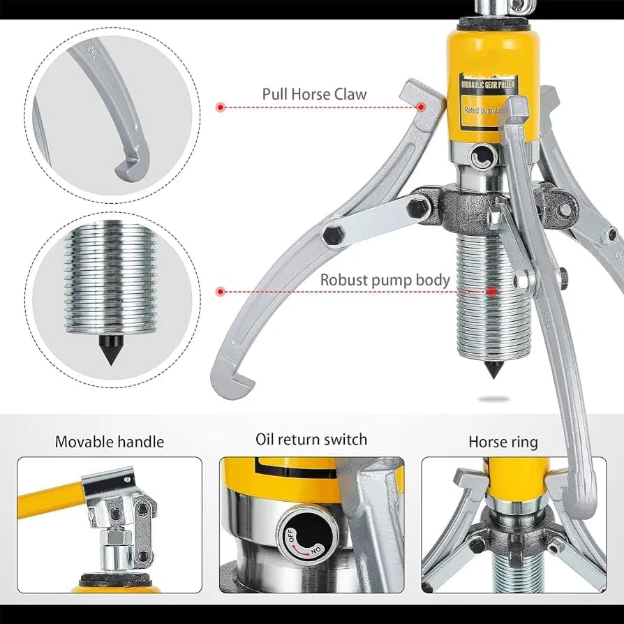 Specifications: – Material: 45# Steel – Max Capacity: 5T – Ares Travel: 50mm – Min/Max Reach: 0 – 140mm – Min/Max Spread: 100 – 200mm Package Contents: – 1x Hydraulic Pump – 1x Handle – 1x 2/3 Leg Puller Yoke – 3x Puller Legs – 6x Nuts and Bolts – 6x Link Plates – 1x Nose Adaptor – 1x Carrying Case – 1x Manual . Carefully read the manual before use. Kindly check the puller on/off switch before use as it should be fully tight and no air should pass through , for good working of puller.